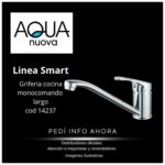 Grifería de cocina monocomando pico largo Aqua Nuova Línea Smart. Diseño moderno, pico giratorio y cierre cerámico. Ideal para cocinas con doble bacha. Calidad y funcionalidad garantizadas.